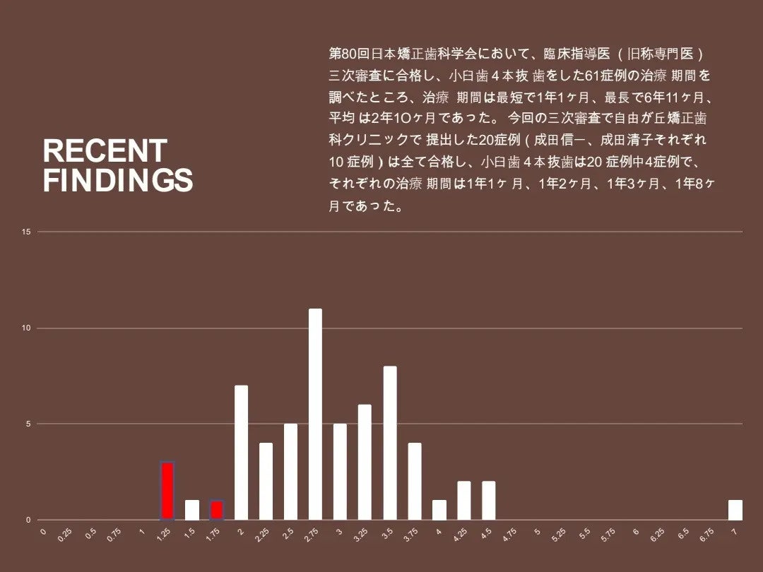 臨床指導医(旧称専門医)三次審査に合格し、上顎片顎抜歯をした30症例の治療期間は治療期間は最短で1年、最長で4年11カ月、平均は2年4か月