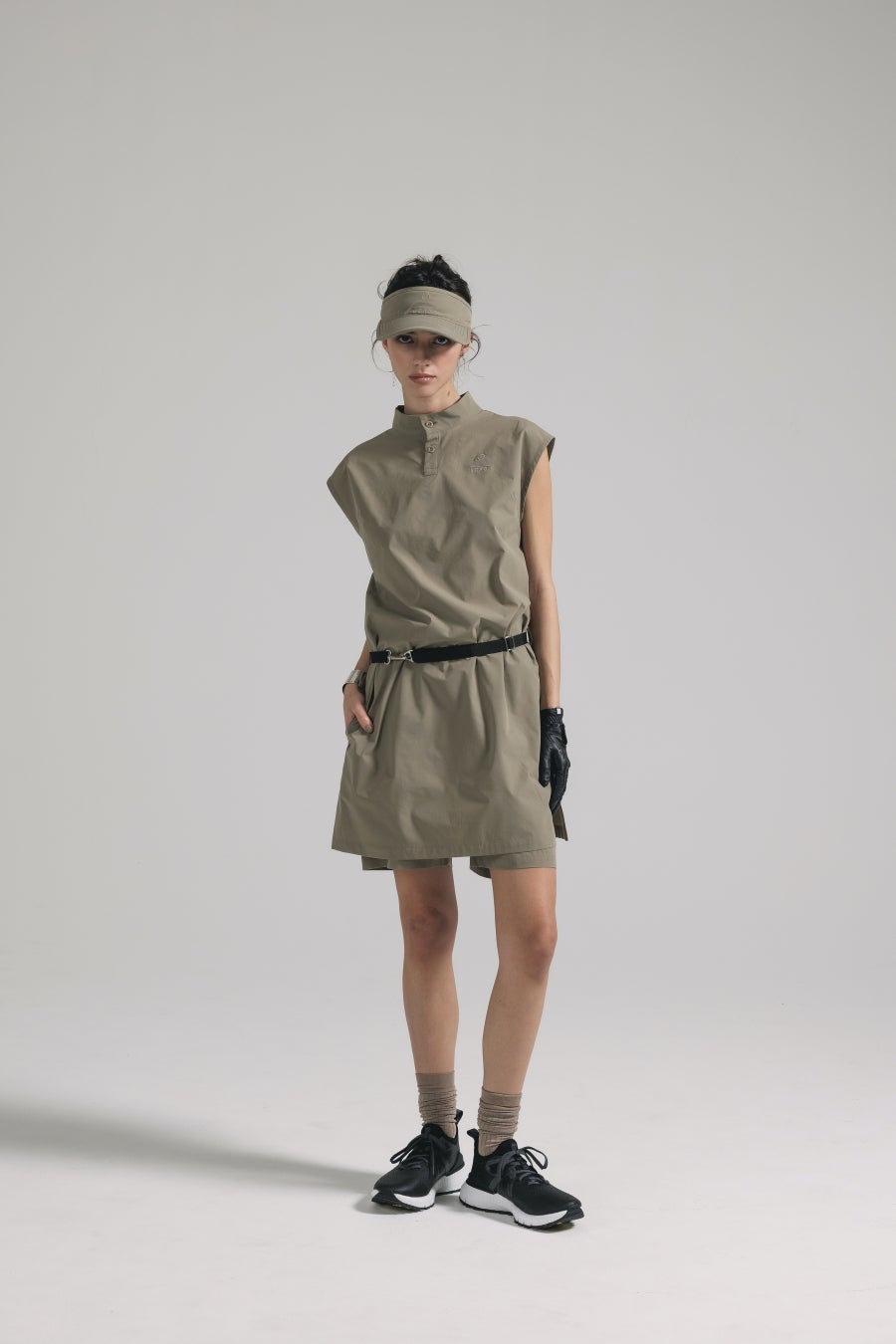 スタンドカラーのノースリーブワンピース。ウエストにはフックで留める別素材のベルトが付属。インナーショーツの丈は少し長めで、ワンピースの裾から少し見せて着用するのがおすすめ。軽量で透湿性や速乾性も兼ね備え、撥水加工が施された4WAYストレッチ素材。¥25,300 tax in