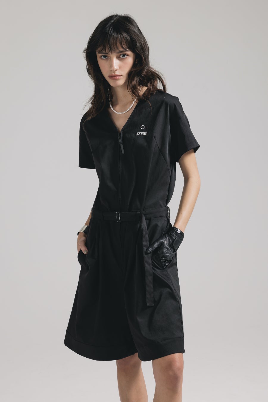 Vネックの半袖オールインワン。袖丈は短めで、パンツの着丈は少し長くゆったり目なデザイン。同素材のベルト付き。撥水加工されたストレッチツイル素材。¥25,300 tax in