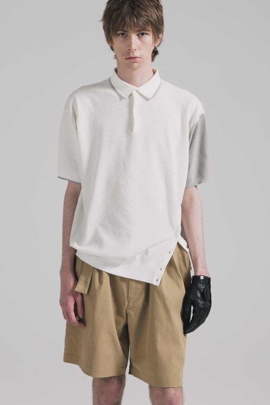 左袖が配色デザインの鹿の子編みニットポロシャツ。右後ろにポケット付き。左裾のボタンを開けて着用することも可能。伸縮性の良いドライタッチの綿ポリエステル素材。¥19,800 tax in