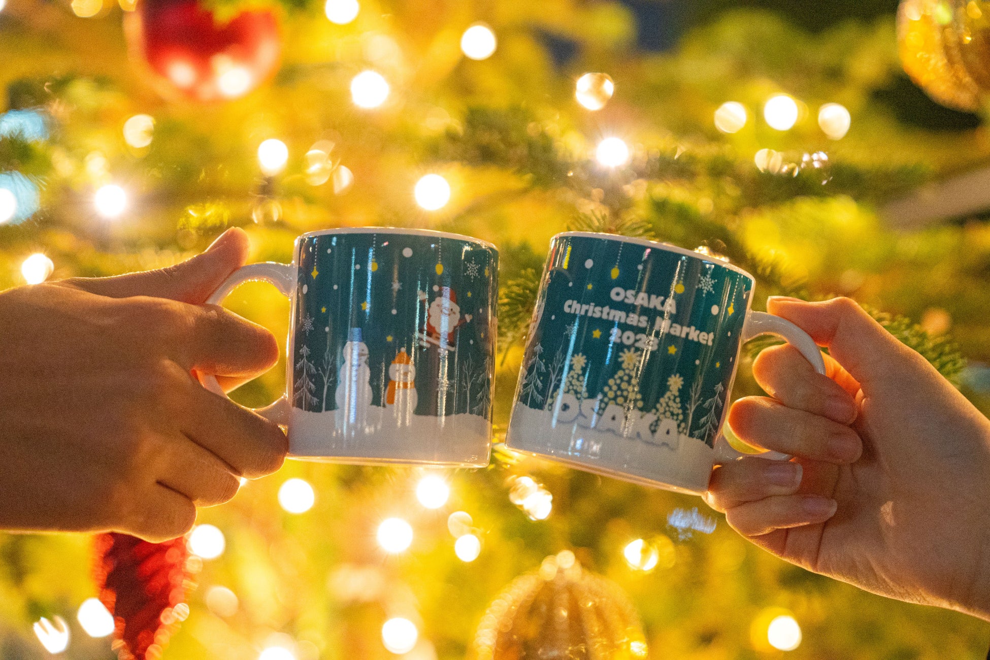 体の芯から温まるグリューワイン(スパイス入りホットワイン)をクリスマスマーケットin大阪「オリジナルマグカップ」で提供。またドイツビールやホットココアをはじめ、ソーセージやプレッツェル、スープなども販売。クリスマスをモチーフにしたアイシングクッキーやスイーツも盛りだくさん!