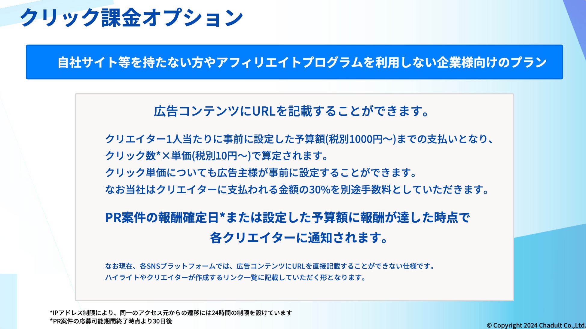 事前にクリック課金予算とクリック単価を設定いただき、再生数による報酬とクリックプランでのセミアフィリエイト形式でクリエイターにご依頼可能です。