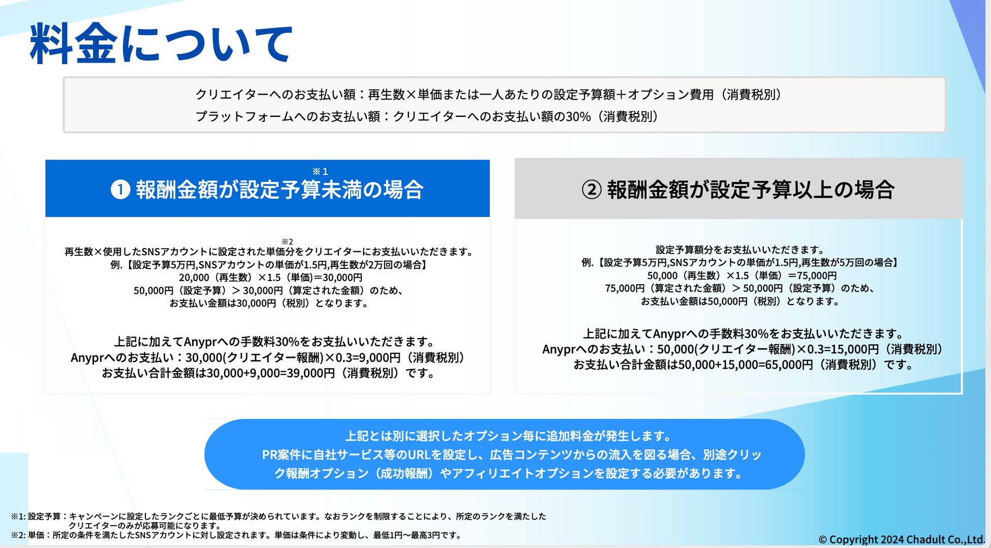 Anyprでは、事前に設定した予算の範囲内で、PR動画の1再生数あたり1円から最大3円という成功報酬制度を採用した、新しい報酬形態を採用しています。