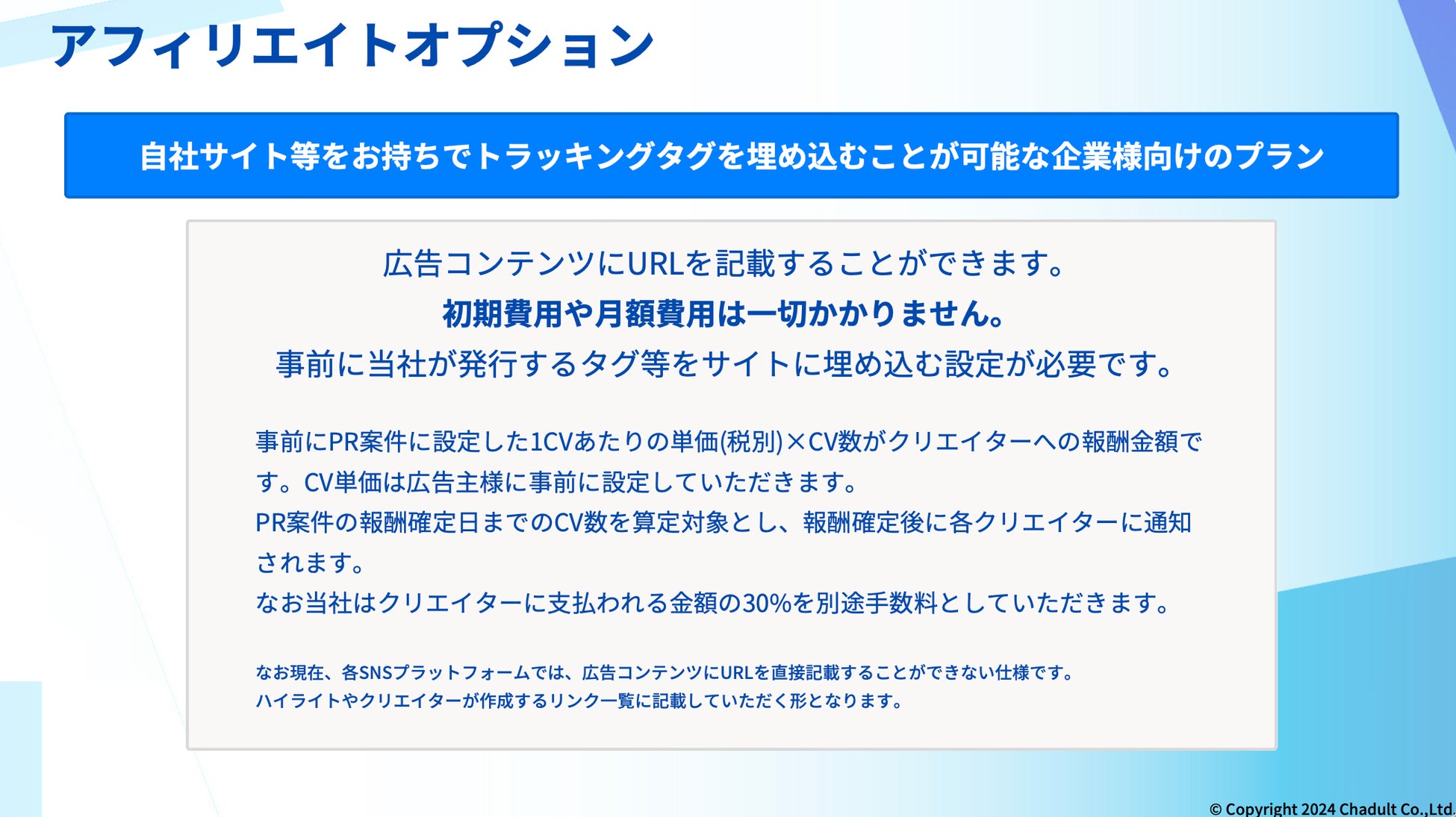 事前にアフィリエイト単価と貴社サイトにアフィリエとタグを設定いただき、再生数による報酬とアフィリエイトプランでのセミアフィリエイト形式でクリエイターにご依頼可能です。もちろんクリックオプションと同様に効果測定も可能です。