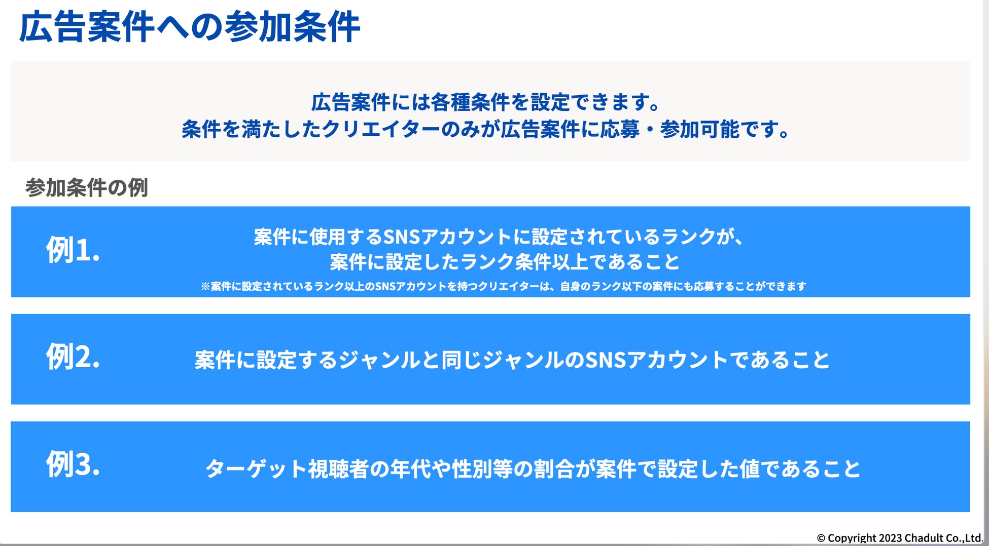 事前に貴社商材のターゲット視聴者を想定し、年齢層や視聴者の男女比、平均再生数など多くの条件でクリエイターの応募に制限をかけることができ、工数負担を大幅に軽減することができます。