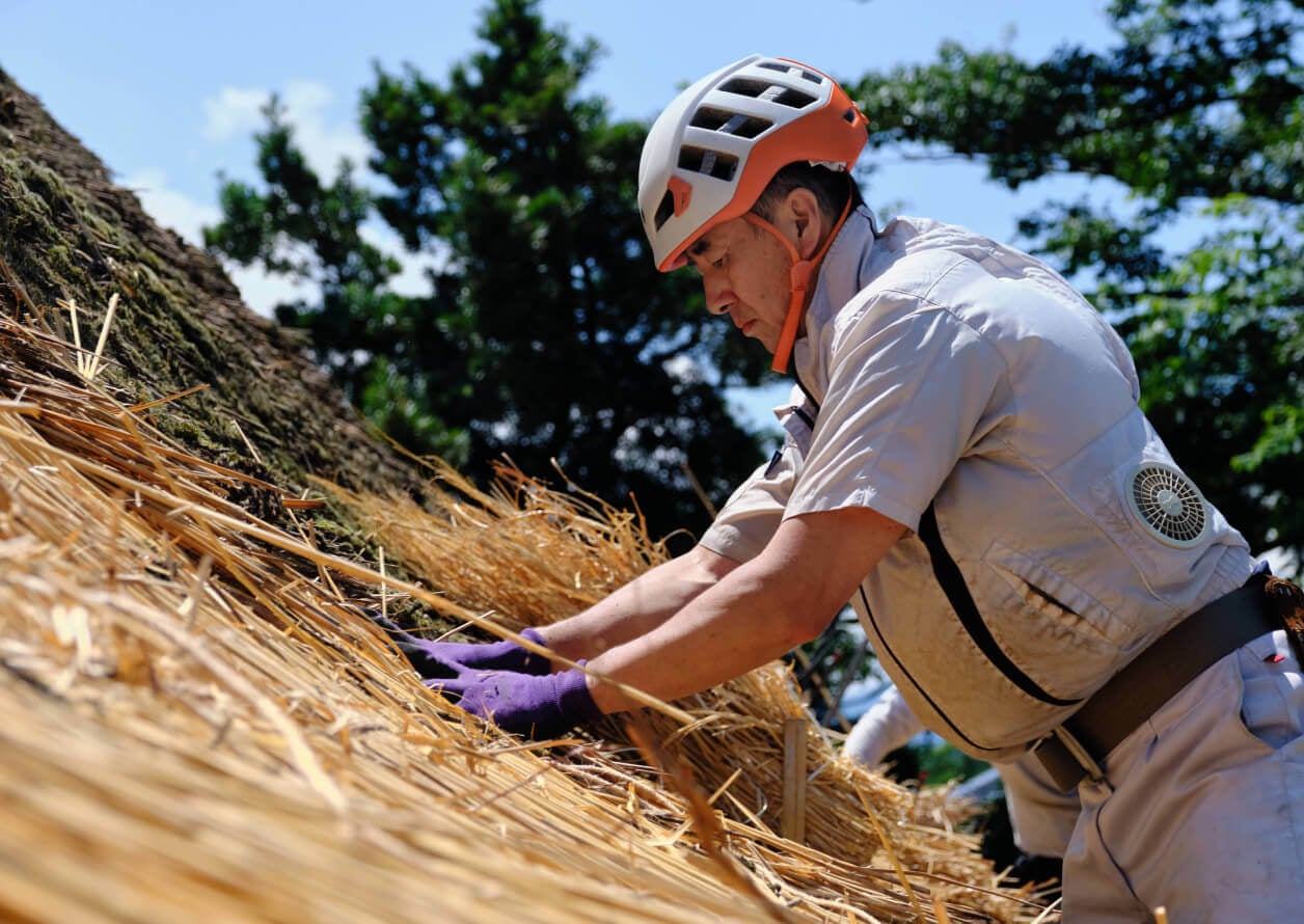 「茅刈りレスキュー」では、茅葺き職人のレクチャーを受けながら、参加者の皆さまにススキを刈り取っていただきます。京都に本社を構える山城萱葺株式会社の代表取締役社長であり、職人歴28年の茅葺き職人である山田雅史さまにお越しいただき、ご指導いただきます。