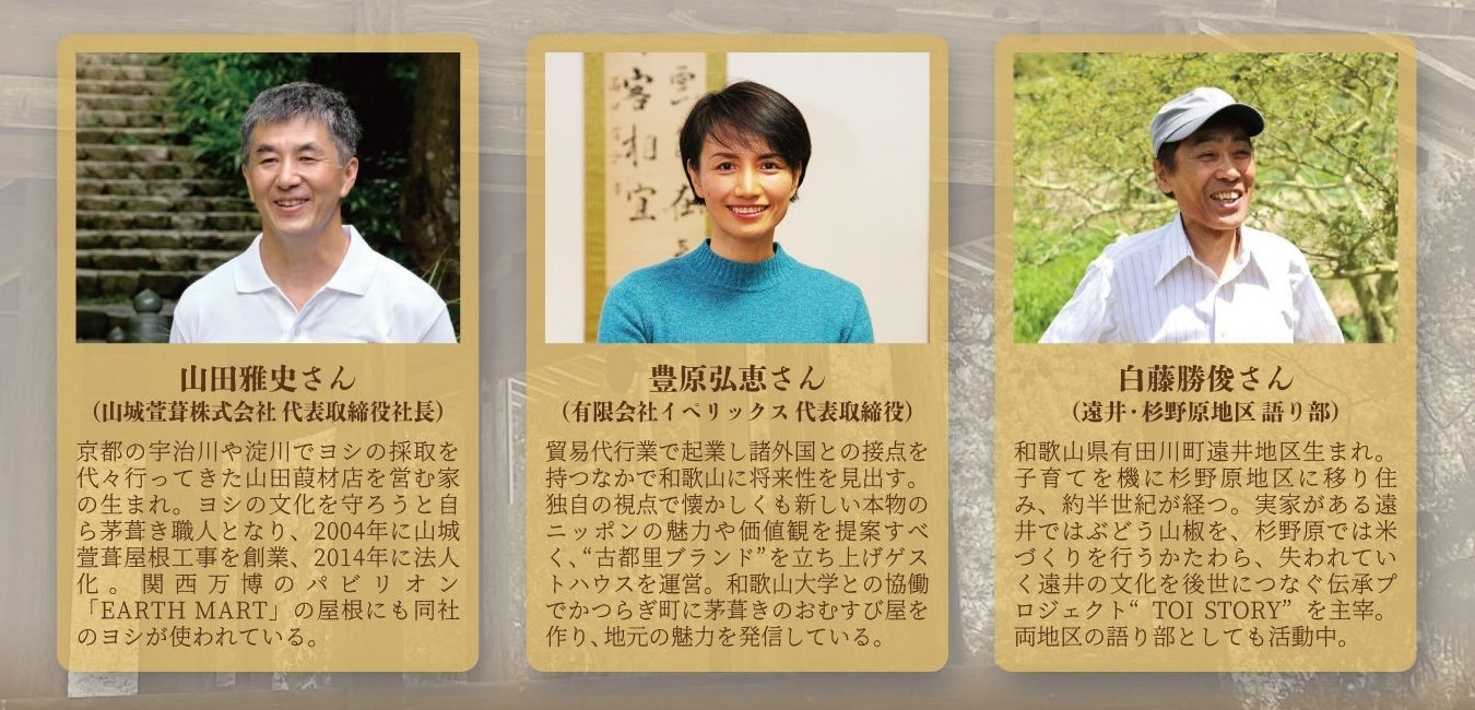 山城萱葺株式会社の代表取締役社長。京都の宇治川や淀川でヨシの採取を代々行ってきた山田葭材店を営む家の生まれ。ヨシの文化を守ろうと自ら茅葺き職人となり、2004年に山城萱葺屋根工事を創業。2014年、現在の山城萱葺株式会社として法人化。EXPO2025 大阪・関西万博のパビリオン「EARTH MART」の屋根にも、山城萱葺株式会社のヨシが使用されていました。