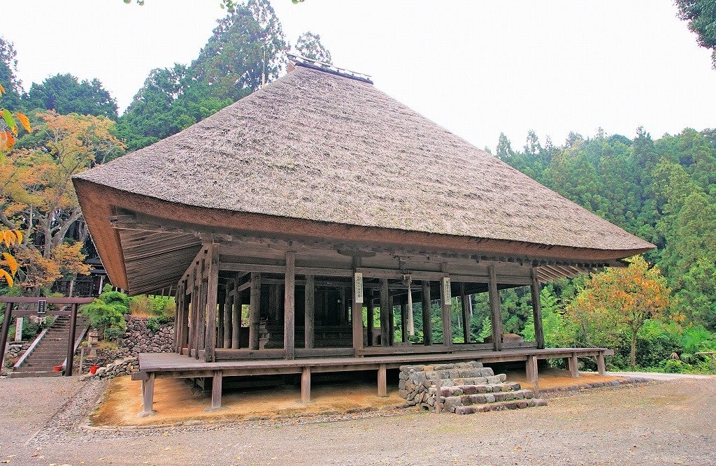 高野山の麓、“歴史の隠れ里”とも言われる有田川町杉野原地区で、古来よりこの地に暮らす先人たちが守ってきた「雨錫寺阿弥陀堂」。現在の阿弥陀堂は永正11年(1514年)に建立されたもので、国の重要文化財に指定されています。重厚な茅葺き屋根で、桁行・梁間5間(11.67m)の一重寄棟造、須弥壇と厨子を置く他は間仕切りがない開放的な建築が特徴です。