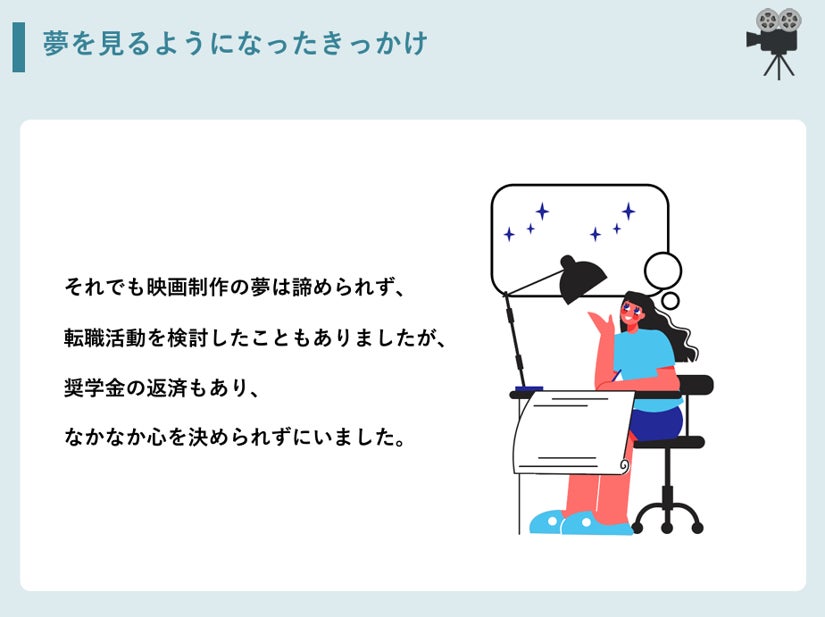 サイトに掲載されている動画とレポートのサンプルは、応募を検討する方がわかりやすいような内容となっています、これはフォーマットという訳ではないので、もっとフランクに「あなたの夢」を教えてください。