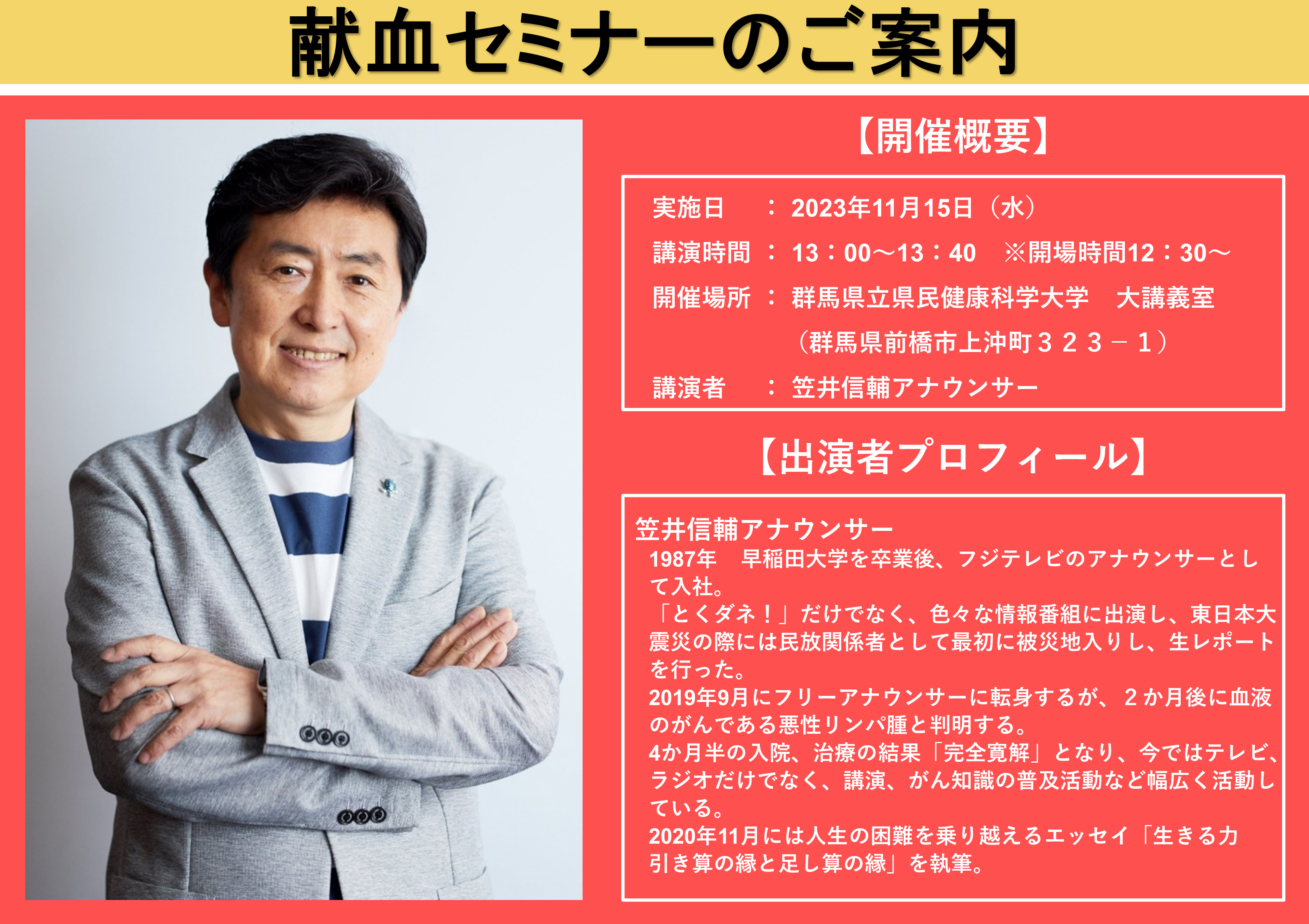 輸血経験者である笠井信輔アナウンサーを迎え、ご自身の闘病体験、輸血治療の経験を通して、群馬県立県民健康科学大学の学生及び関係者、主に群馬県在住の方を対象に「献血」の大切さを伝えていきます。