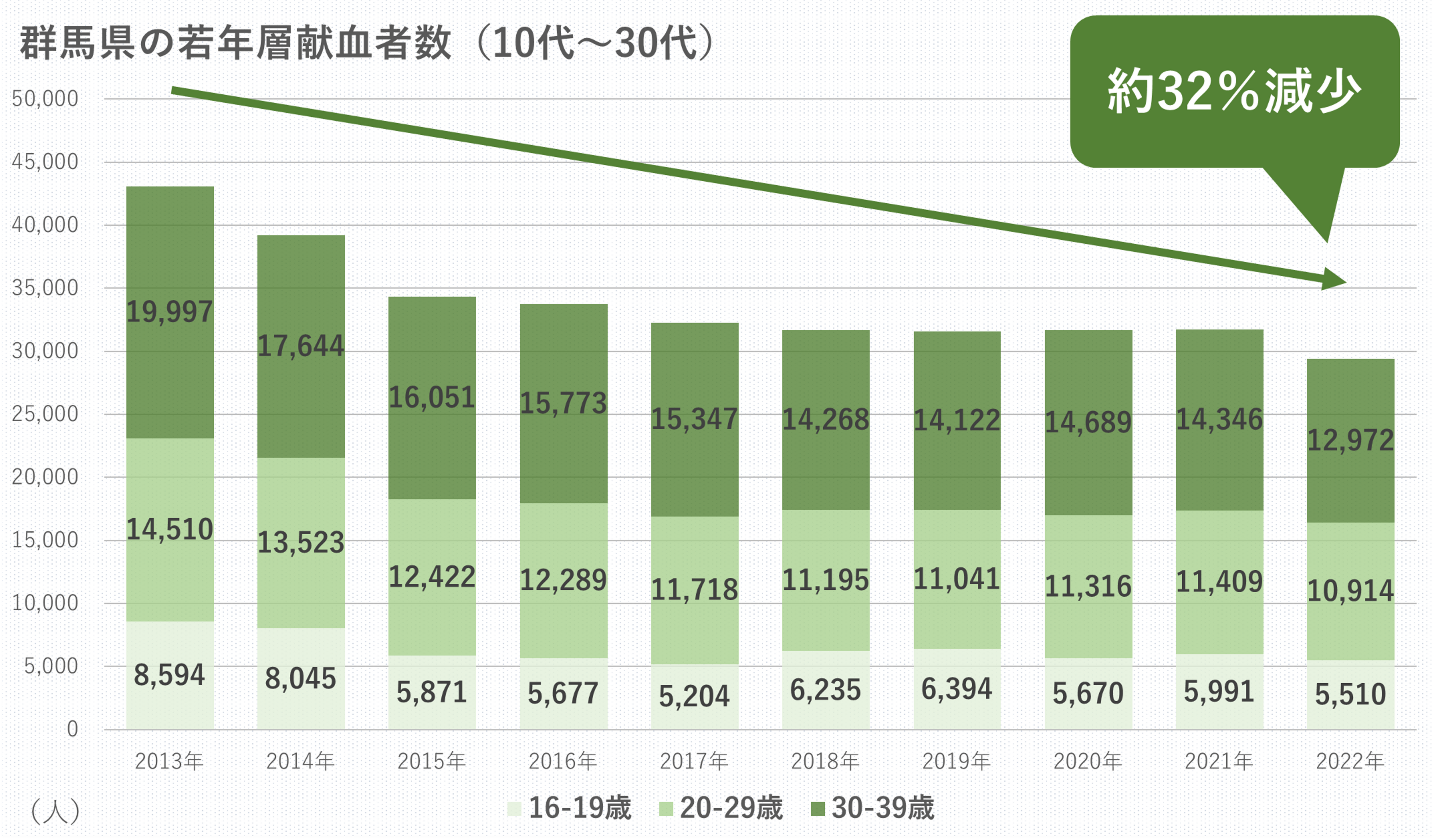 群馬県においても減少が進んでおり、約32%の献血者が減少しています。