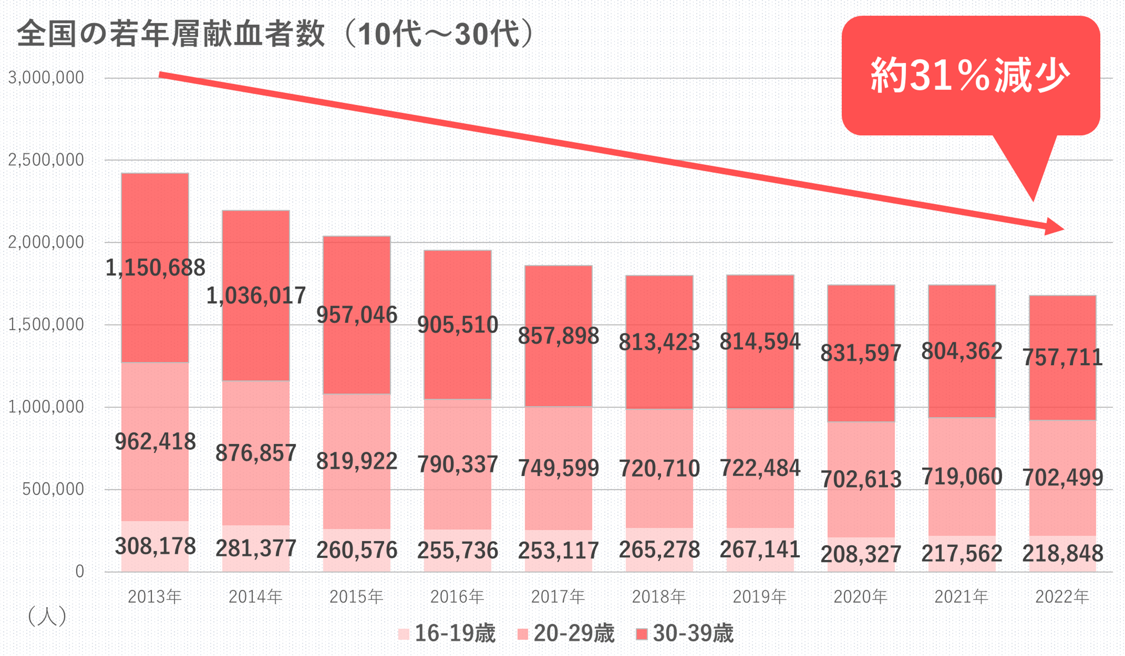 しかし、若年層(10~30代)の献血者数は減少傾向にあり、2013年と2022年を比較すると全国で約31%の献血者が減少しています。