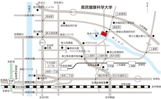 JR「前橋駅」北口6番乗り場、永井バス「荻窪公園」または「小坂子」行き、「県民健康科学大学前」で下車(約15分)