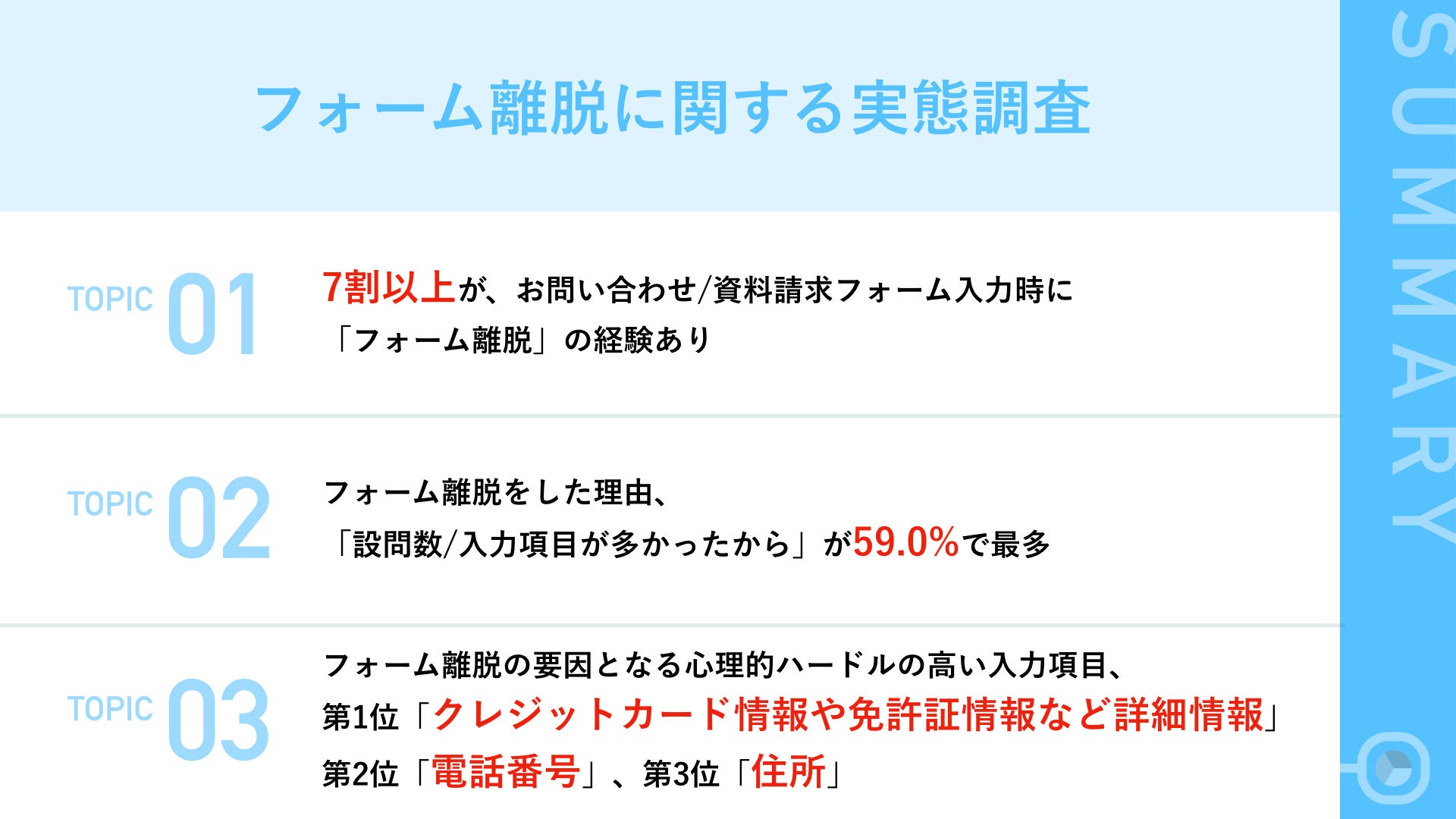 今回の調査では、お問い合わせ/資料請求フォームまでたどり着いたユーザーが、入力の手間や心理的なハードルが原因で「フォーム離脱」している実態が明らかになりました。フォームの入力時に、個人情報の取り扱いに関する不安が心理的なハードルとなる方も多いようです。CV目前のユーザーを逃してしまう要因を取り除くべく、入力補佐機能の検討や、入力項目を見直すなど、フォーム離脱を防止する改善策の実施や便利なツールの導入を検討してみましょう。