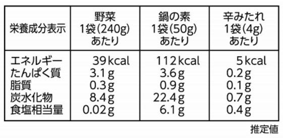 内容量 :カット野菜240g(白菜、緑豆もやし、長葱、ニラ、ぶなしめじ)、
