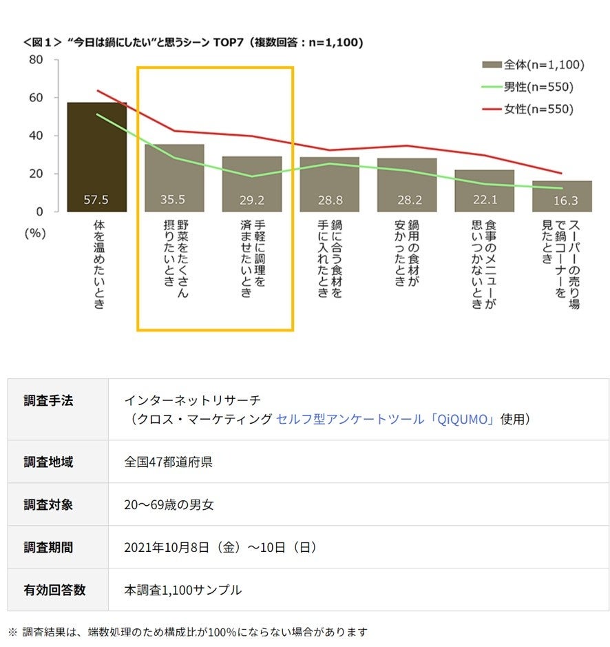 10月に入り次第に秋の兆しを感じられる気候になってきました。気温の低下とともに鍋メニューを選択される方が増加し、週1回以上鍋を食べる方が45%にもなります。 “野菜をたくさん食べたい”“温まりたい”ということが大きなニーズです。近年では個食タイプの鍋つゆの浸透を受けて、“おひとり鍋”の需要も拡大しています。