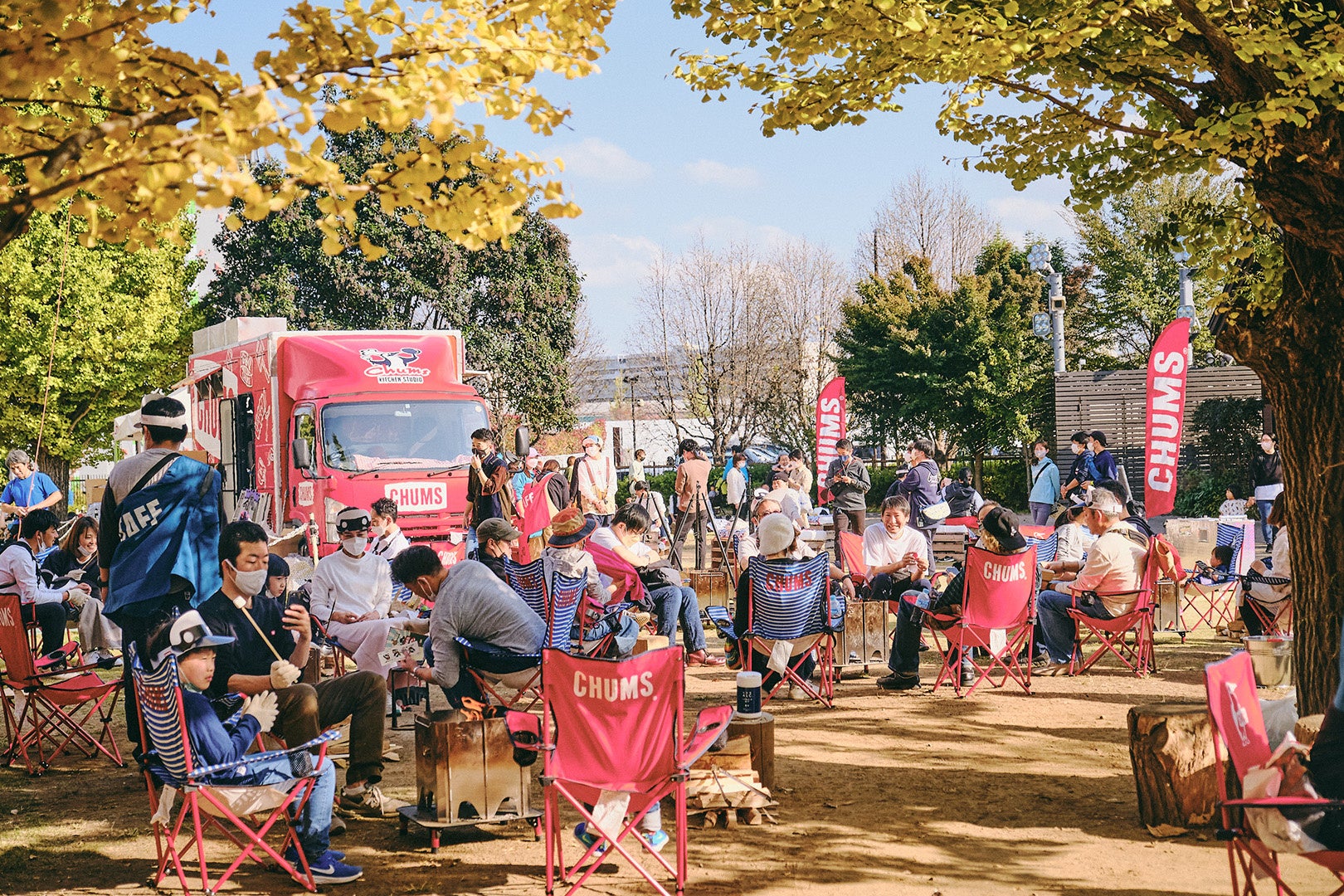 ・イベント内容:ピクニックエリア、焚火(たきび)であぶったマシュマロ&焼きいも作りワークショップ、「CHUMSキッチンスタジオ」BBQグルメ販売、クラフトワークショップ、アウトドアゲームズ、40周年記念フォトスポット、キャンプギア祭り、限定グッズ販売、CHUMS製品が当たるガラポン抽選会、2023秋冬コレクション・ファッションショーなど