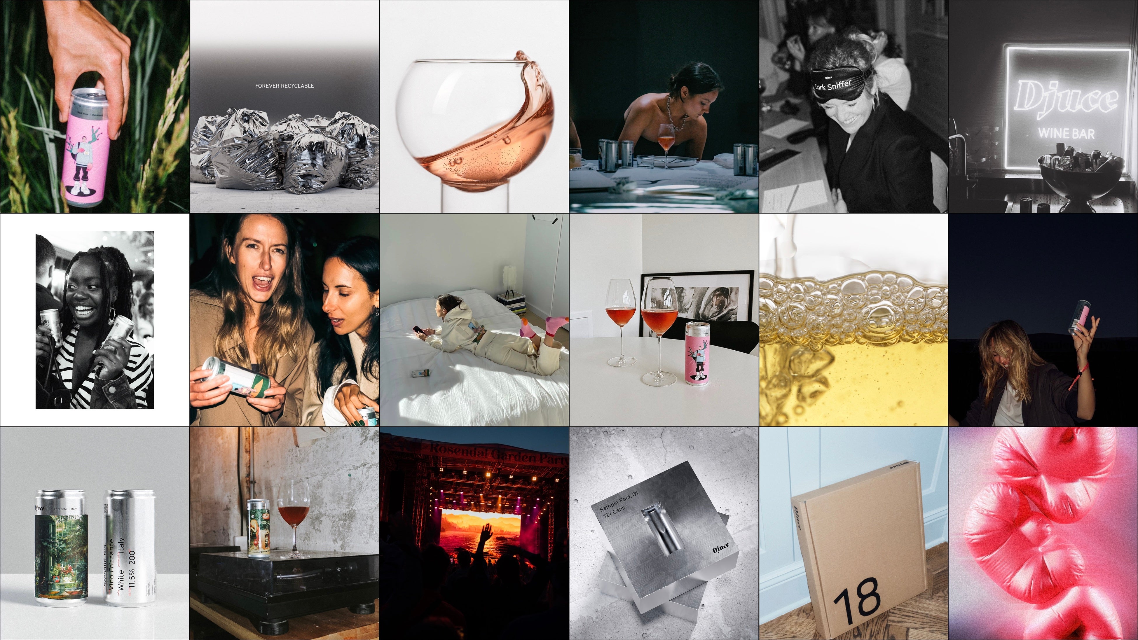 2022年にスウェーデン・ストックホルムで誕⽣したDjuce(ディージュース)。アートなデザインで目を引く缶の中身は、ヨーロッパ各国(フランス、イタリア、スペイン、オーストリア、他)の素晴らしい造り手のナチュラルワイン。従来のガラスボトルよりもアルミ缶の方が圧倒的に環境負荷が少ないことに着目し、美味しいワインを提供しながら地球環境を守ることを⽬標としています。