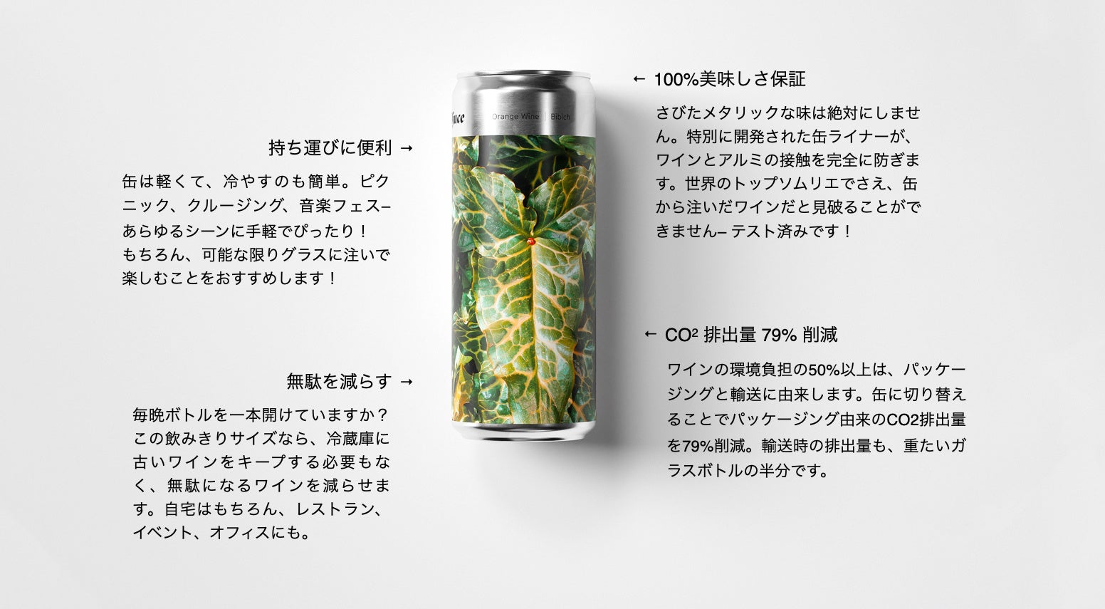 ちょうど良い飲み切りサイズで、アルミ缶は捨てるのが楽。リサイクル率の高い環境にやさしいパッケージングだということも嬉しいポイント。気軽に上質なナチュラルワインが楽しめます。