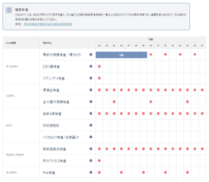 がん検診の中には数年に1回の頻度での受診が適切なものが多くあります。そこで、「マイ検診プラン」では15年間の長期に亘る検診プランをレコメンドします。