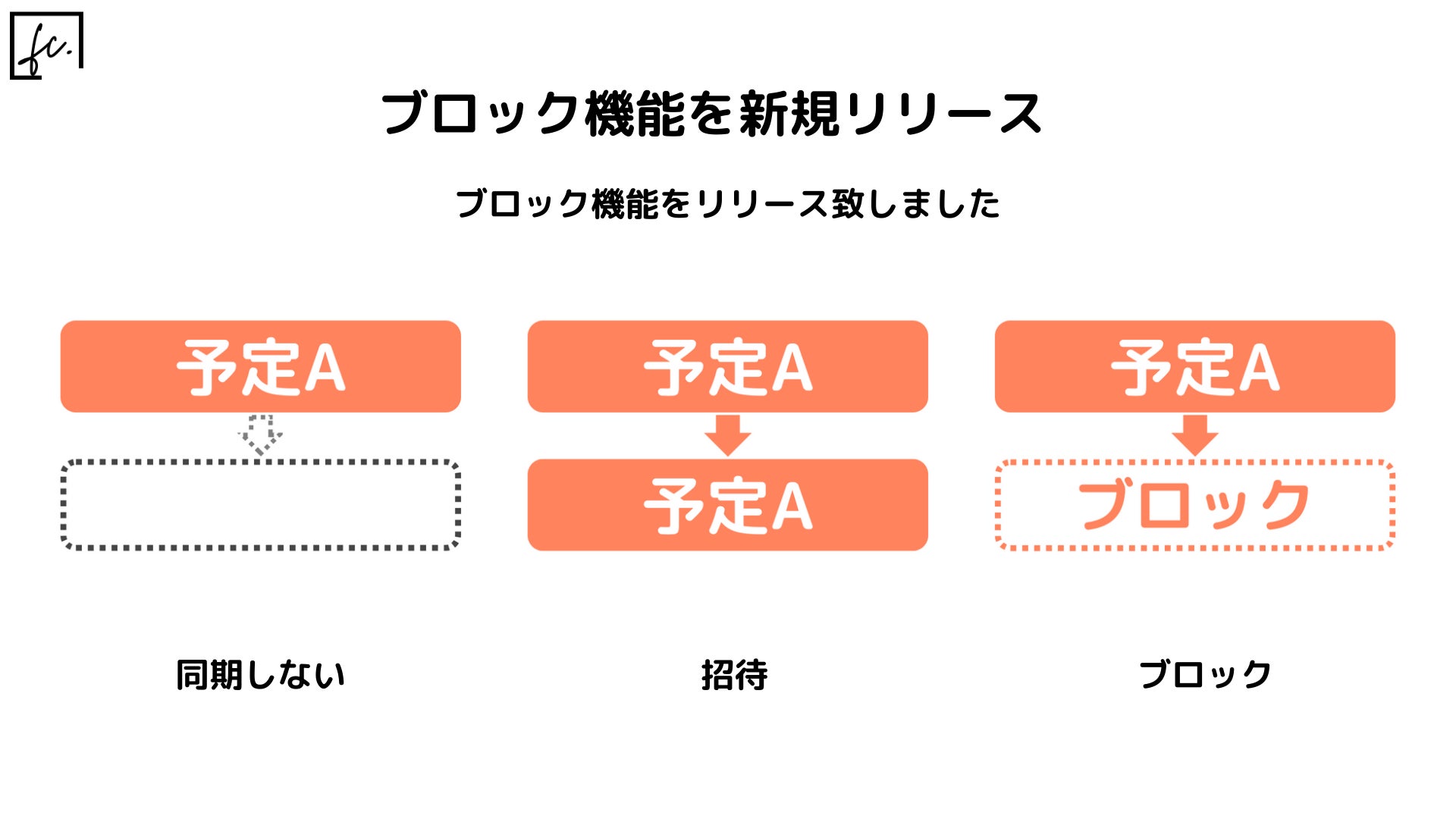 従来より提供しておりました、招待機能に加え、今回リリースするブロック機能を組み合わせることで、2つのカレンダーの同期パターンは、5つに増加します。