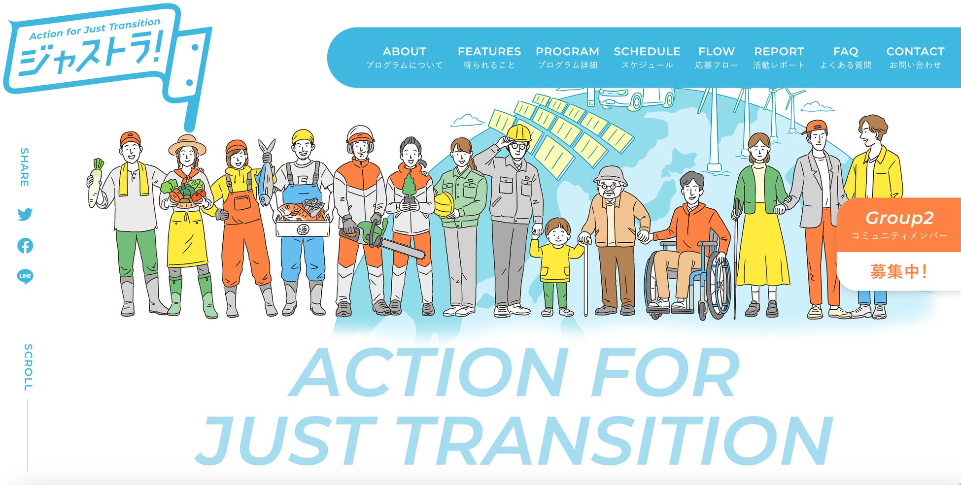 誰一人残さず公正な形で地域社会をグリーンシフトさせていく意思のある地域の中小企業・中間支援組織を対象に各地域のジャス・トランジション(公正な移行)に向けたビジネスモデルづくりを支援するプログラム「ジャストラ!」。J.P.モルガンがグラントを提供し、ETIC.が2年間にわたりプログラム全体の運営・推進し、1年半かけて公正な移行に向けたビジョンづくり、事業構想の作成・具体化を行っています。