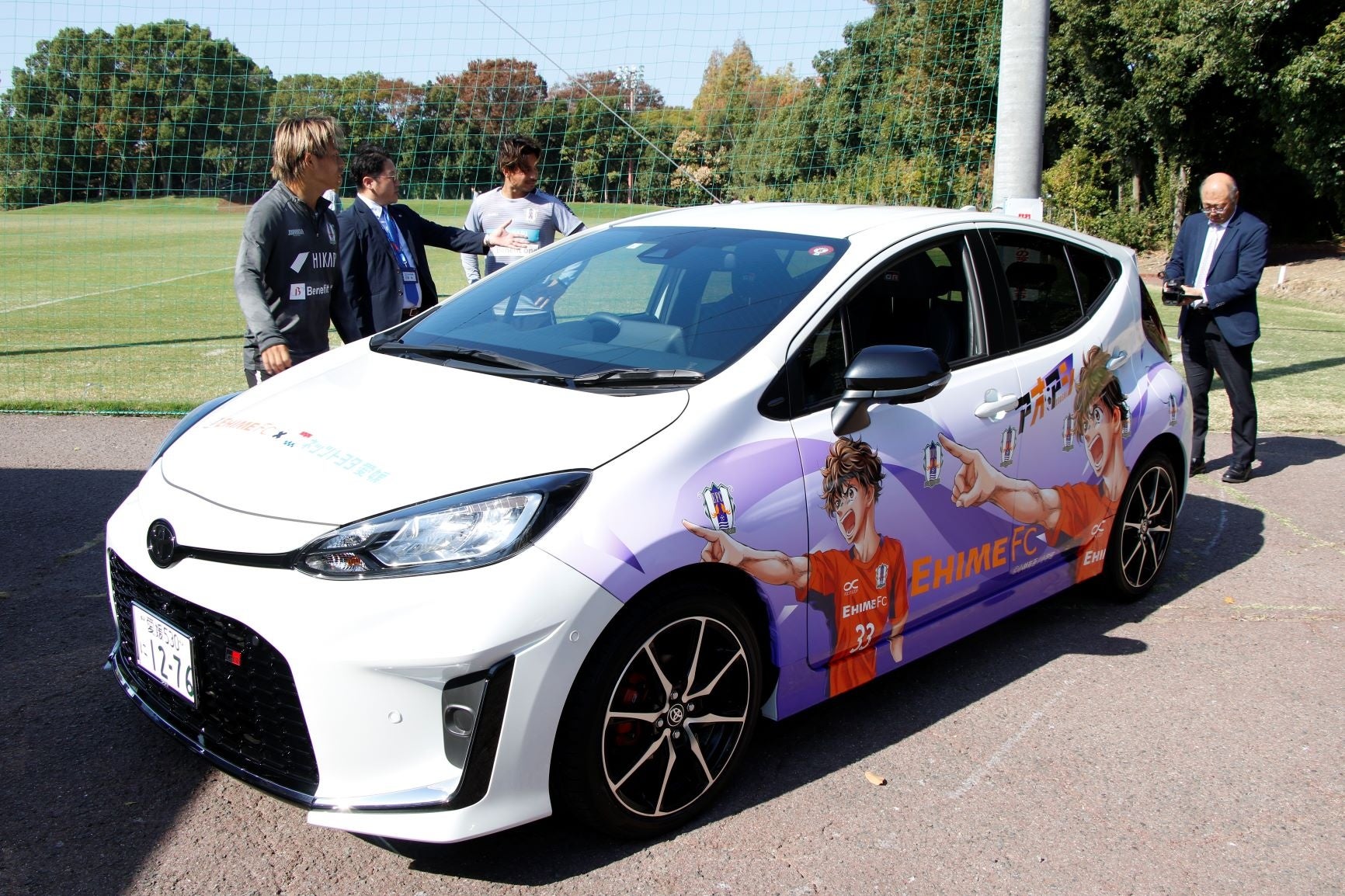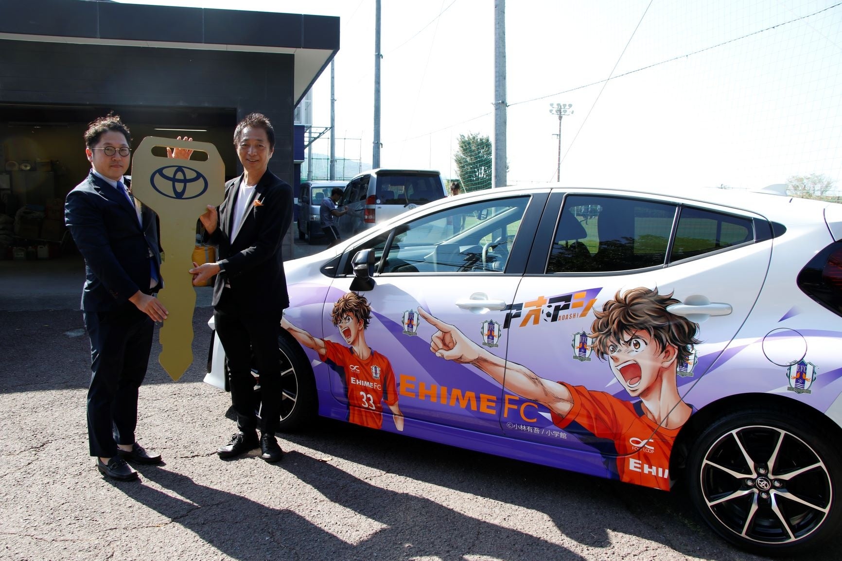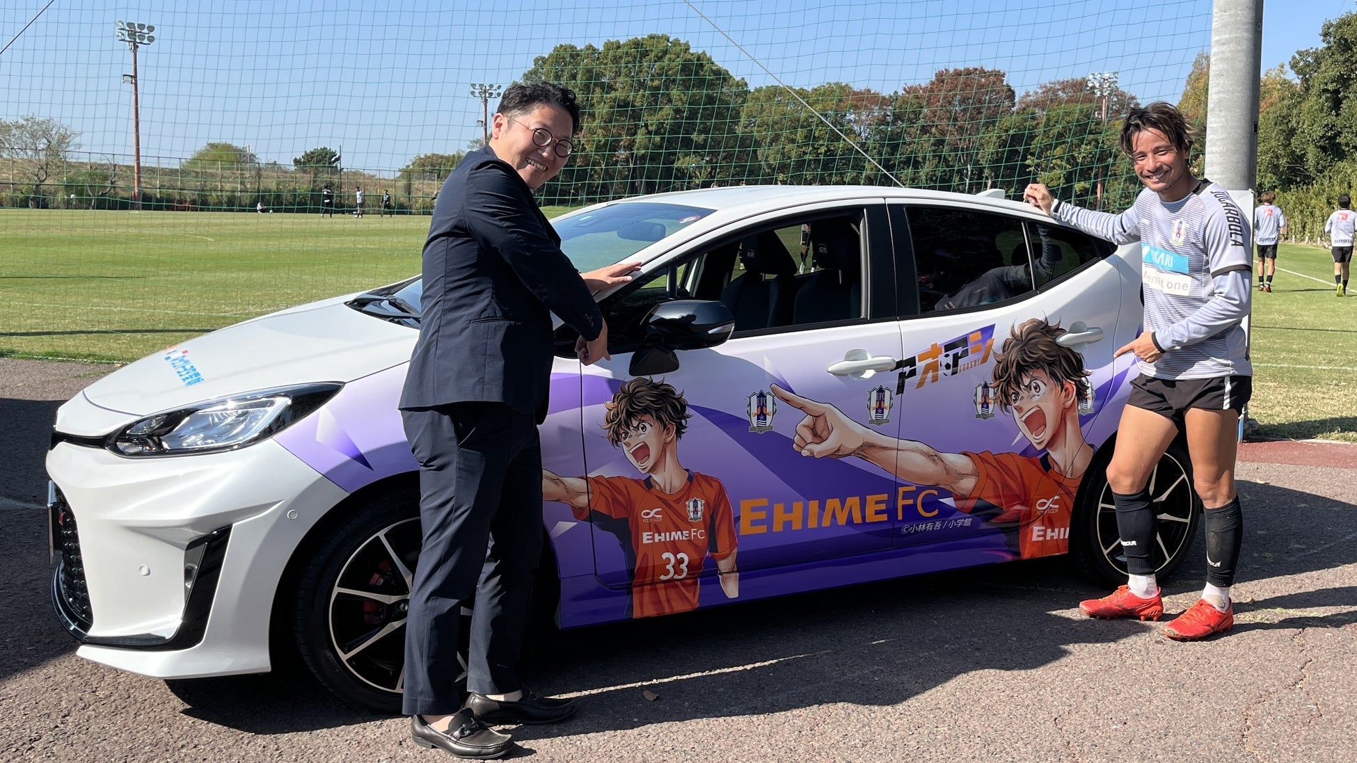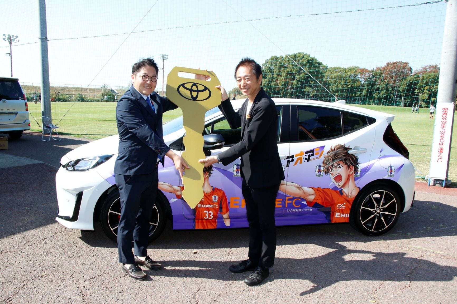 この度、11月11日に開催されるFC今治との「伊予決戦」を、そして同じく11月18日より開催されます「アオアシ展」を盛り上げるためにスポンサーであるネッツトヨタ愛媛株式会社様より車両を寄贈いただきました。