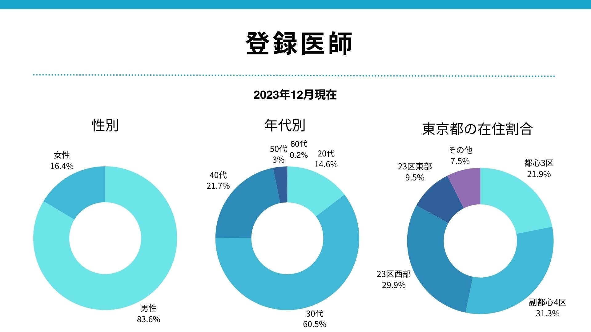 現在、登録医師は1000人以上です。性別比は、男性:女性=83.6:16.4と男性が非常に多いです。年代別で見ると、30代が約60%、次いで40代、20代となっています。東京都の在住割合では、都心3区・副都心4区で約50%以上であり、都心に多く在住しております。