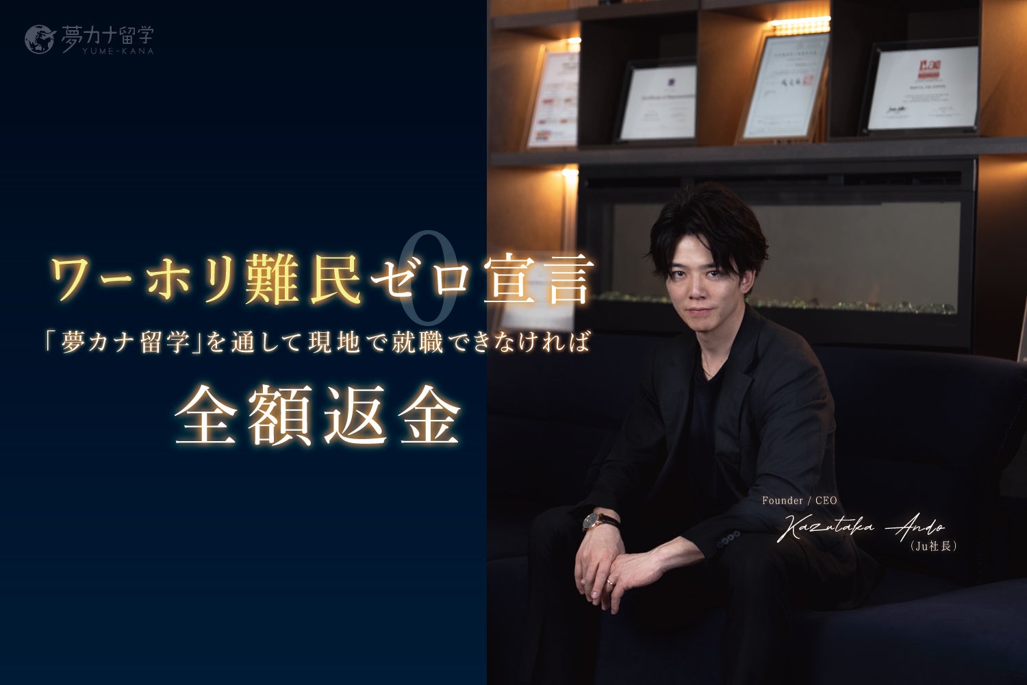 【留学業界初】ワーホリ難民ゼロ宣言!渡航者の98.4%が3.1週間以内に希望の職場で就業している脅威の実績!「夢カナ留学」を通して現地で就職できなければ全額返金!