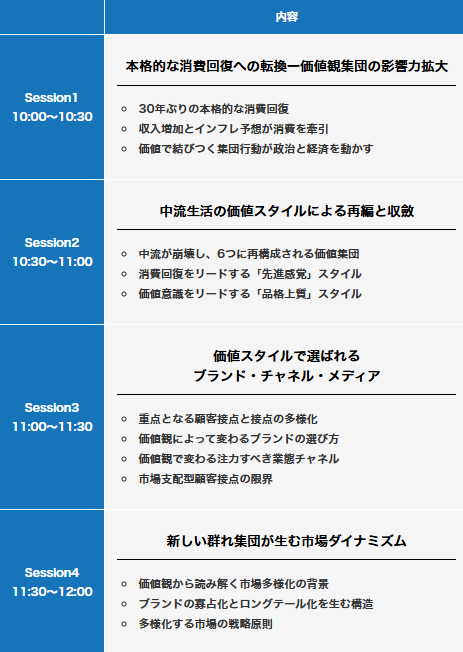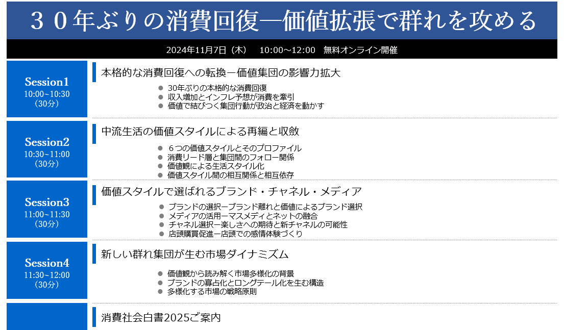 Session1 10:00~10:30 | 本格的な消費回復への転換ー価値集団の影響力拡大 ・30年ぶりの本格的な消費回復 ・収入増加とインフレ予想が消費を牽引 ・価値で結びつく集団行動が政治と経済を動かす |