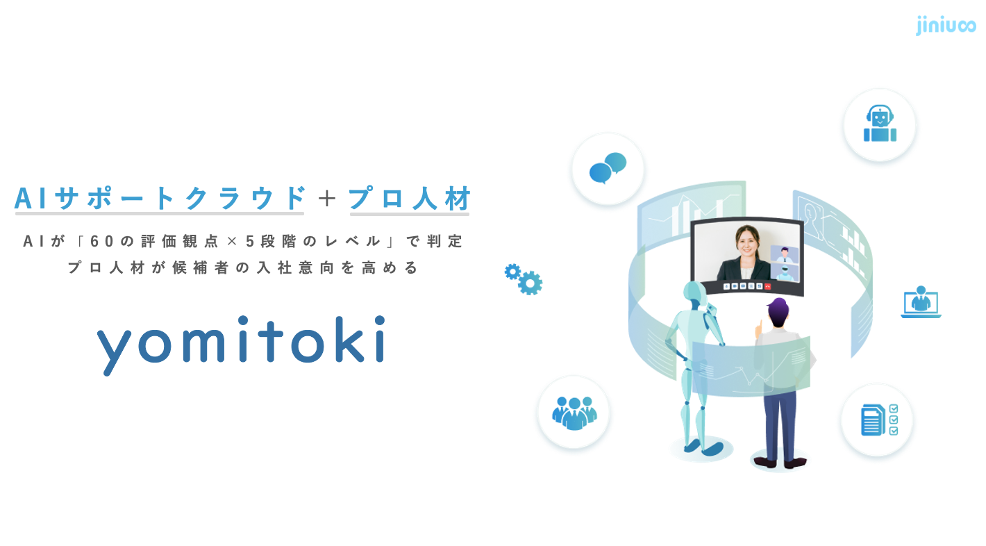 支援先企業や100社近くの企業へのインタビューから、これらの課題は人事部門自体が人手不足であり、日々の業務に追われて改善活動に取り組めていないことが最大の原因であることがわかりました。このような背景から、jiniusはAIと人それぞれの長所を生かし人事や面接官をサポートするyomitokiサービスの提供を開始しました。