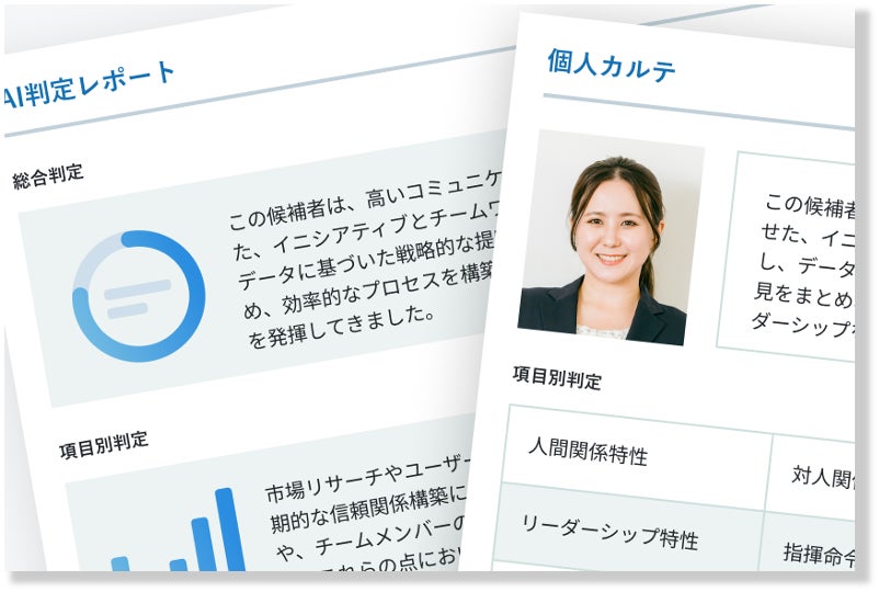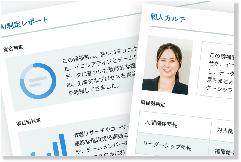 AIが[60の評価観点×5段階のレベル]で候補者を客観的に判定し、プロ人材が候補者の入社意向を高める。AIが得意な領域と⼈にしかできない領域を組み合わせ、採⽤選考プロセスのDX化を実現します。