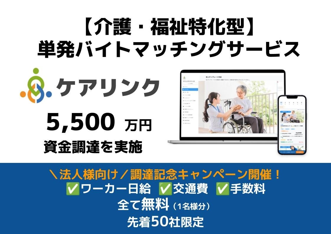 「ケアリンク」は、初の資金調達を記念した「初回無料お試しキャンペーン」を4月7日より開始いたします。初回マッチングに限り、ワーカーの日給・交通費・手数料がすべて無料でご利用いただけます。