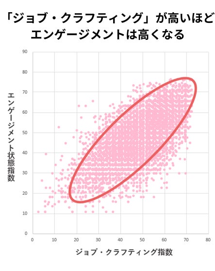 ヒューマネージの研究でも、右図の通り、ジョブ・クラフティングとエンゲージメントには強い相関がみられ、ジョブ・クラフティングがエンゲージメント向上のカギであることが判明しています。