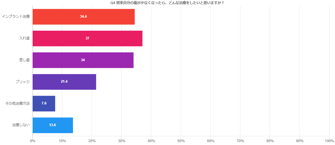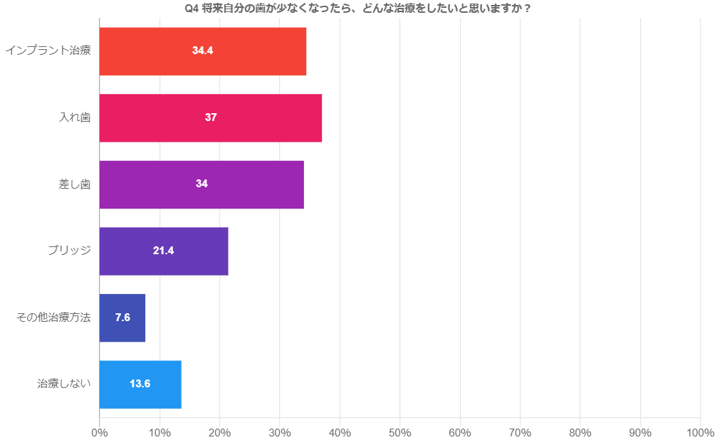自分の歯が少なくなった際の選択肢は「入れ歯(37.0%)」、「インプラント治療(34.4%)」、「差し歯(34%)」と上位3つはほぼ横並びとなりました。
