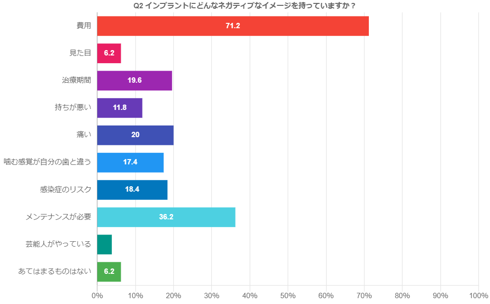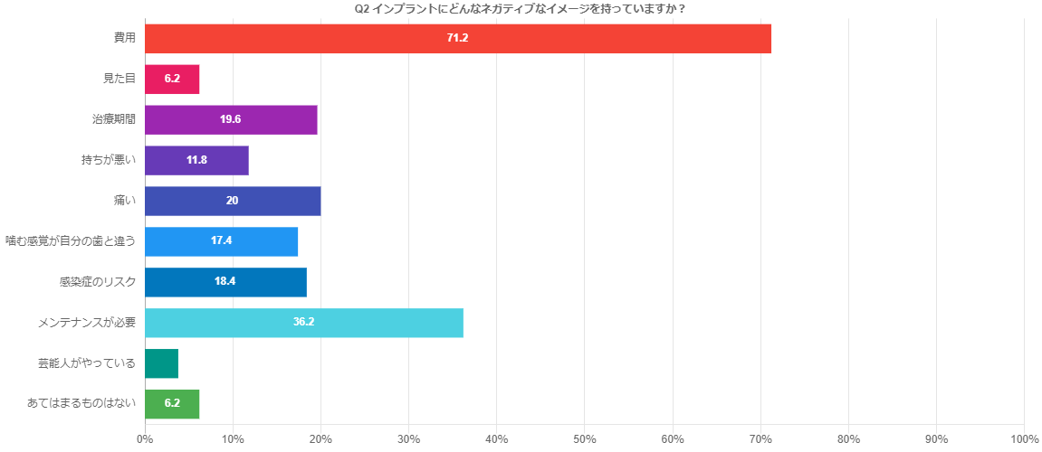 票数が横並び気味だったポジティブなイメージとは打って変わり、ネガティブなイメージでは突出して治療費用が負担になると考えている人が7割以上(71.2%)いることが判明しました。また、「費用(71.2%)」と比較して割合は低いものの、「メンテナンスが必要(36.2%)」、「痛い(20%)」といった治療に関する項目が続いています。