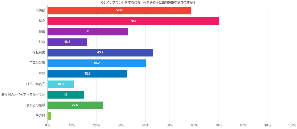「料金(70.2%)」が圧倒的となっており、費用へのネガティブなイメージが反映された結果となりました。次いで「実績数(58.6%)」、「保証制度(43.2%)」、「丁寧な説明(40.2%)」が票を集め、治療を受ける場合は安心感も重視されることがわかりました。
