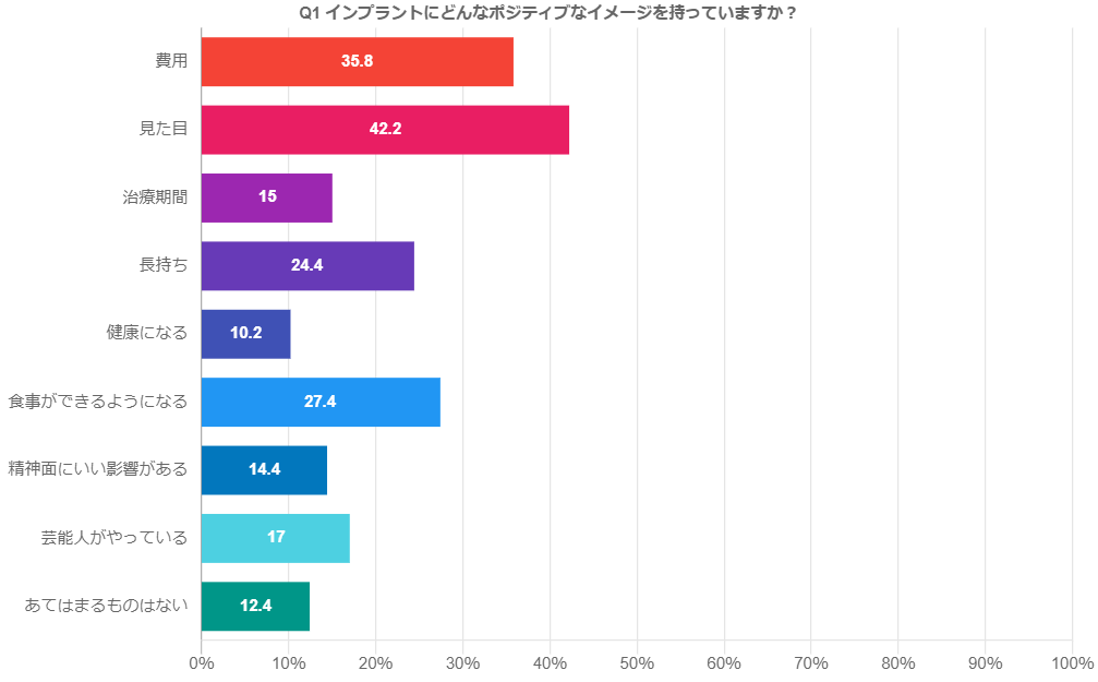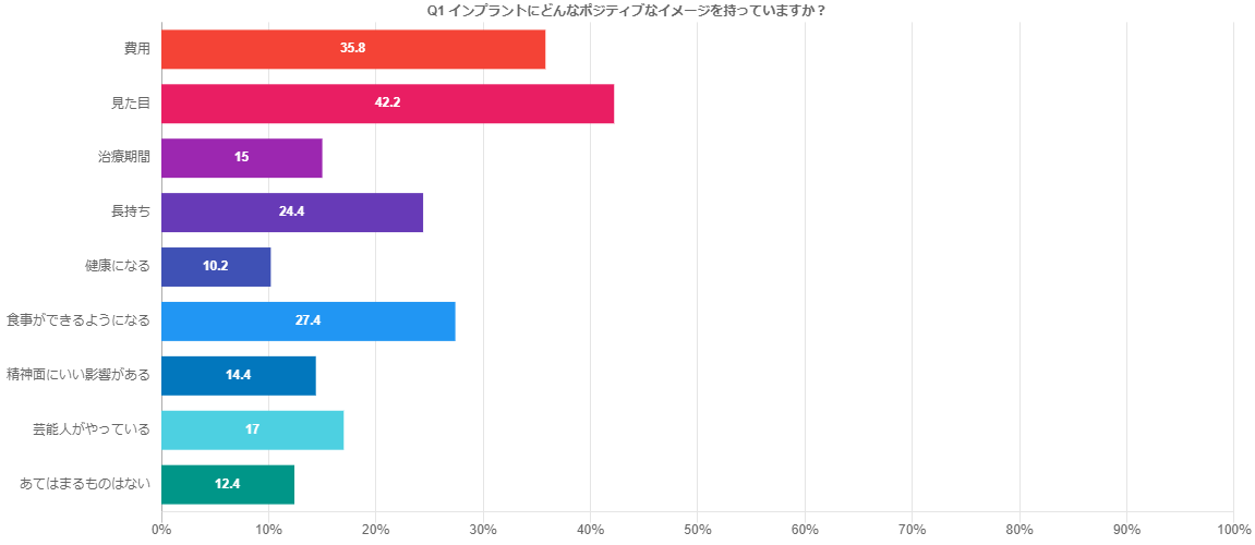 回答で最も多かったのは「見た目(42.2%)」、次いで「費用(35.8%)」、「食事ができるようになる(27.4%)」という結果となりました。「食事ができるようになる」といった実生活での機能よりも、見た目に対してポジティブなイメージが抱かれていることがわかりました。