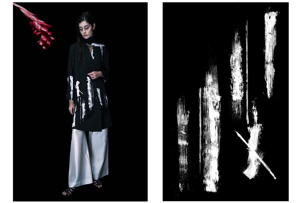 また、シルクの持つしっとりした柔らかい美しさと、大胆な墨アートを融合させることによって、ちりめんの新しい可能性を生み出しています。日常でアートを纏う楽しみを実現すべく、全ての作品がシャープで、都会的なコレクションとなっております。