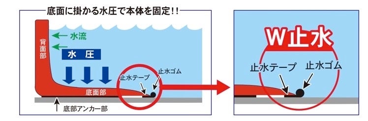 2.底部に止水ゴムと止水テープを配置し洪水初期の水漏れを軽減させました