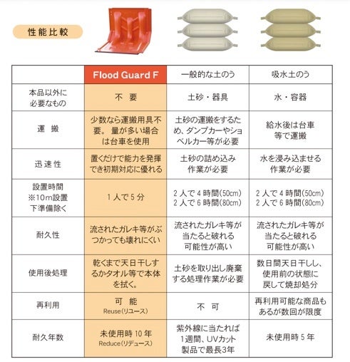 ▲従来の土のうに比べ、簡単に設置することが可能。(ただし、土のうやその他の防災グッズをを併用することで、より万全な治水を実現します)