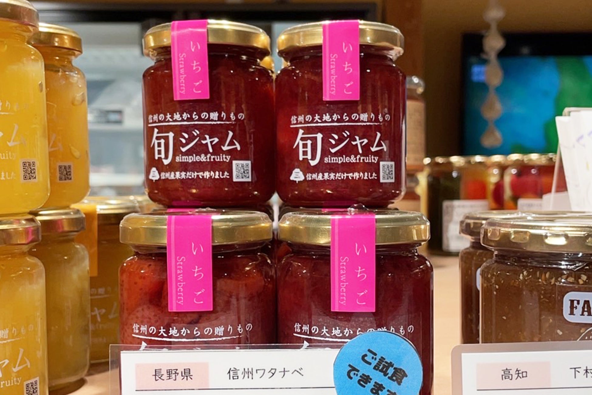 直売所では全国の生産者さんが小規模ながらもこだわりを持って作っておられる食材のほか、自社農場で育てたブランド鶏や農薬不使用のお茶を販売しています。この春の注目商品として、奈良県固有の希少品種「古都華」の特大苺を入荷しました。この苺を生産しているのは奈良県の6FARM(ロクファーム)さん。夫婦2人で営まれており、できる限り農薬や化学肥料に頼らず一粒一粒丁寧に作られています。完全に熟した瞬間に収穫しており、とても甘く味が濃いのが特長です。1粒500円超えの特大サイズはなんと70gを超えることも。贈答用や自分へのご褒美として人気の商品です。その他にも、美味しく食べられるけれど規格外で店頭では売ることができない果実を主な原料とした、長野県信州ワタナベさんのいちごジャムもこの春のイチオシです。