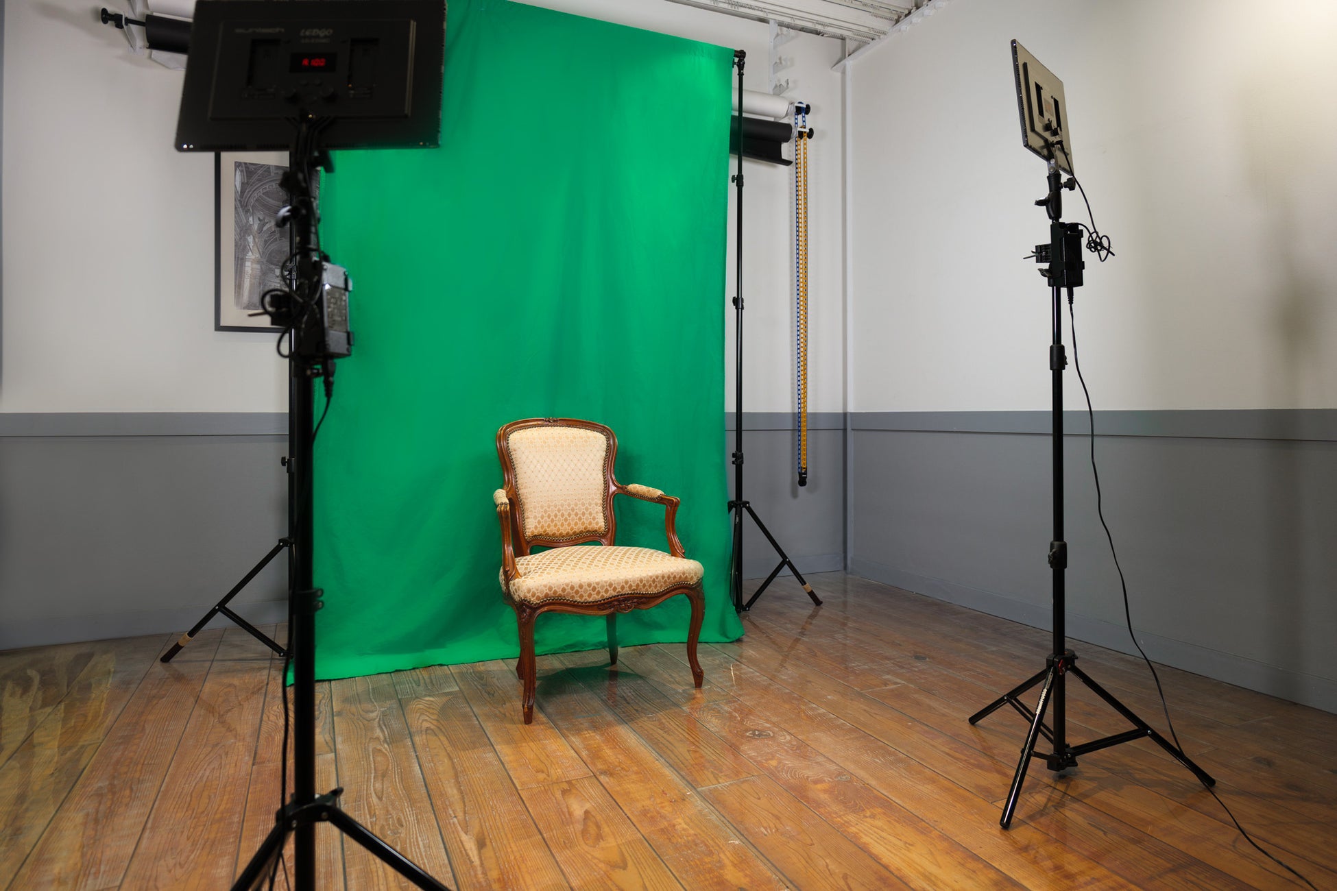 また、さまざまな背景紙をご利用いただける他にも、モノブロックストロボ(COMET TWINKLE 03F-RS)やアンティークソファーやテーブルなどの小物、そして動画撮影に適したグリーンバックやLEDライトの貸し出しも可能です。