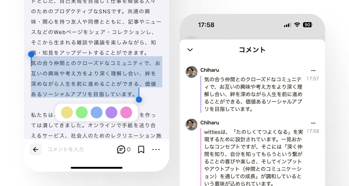 私たちの考えるwittiesが提供する本当の価値は、単なるインプットの共有ではなく、仲間との深いコミュニケーションそしてその先にある深い繋がりだと考えています。ユーザーがコンテンツの概要をサクッとチェックし、じっくり読む記事とそうでない記事を事前に判別したり、時間をかけて記事を読まなくても仲間とのコミュニケーションがより楽しみやすくなりました。
