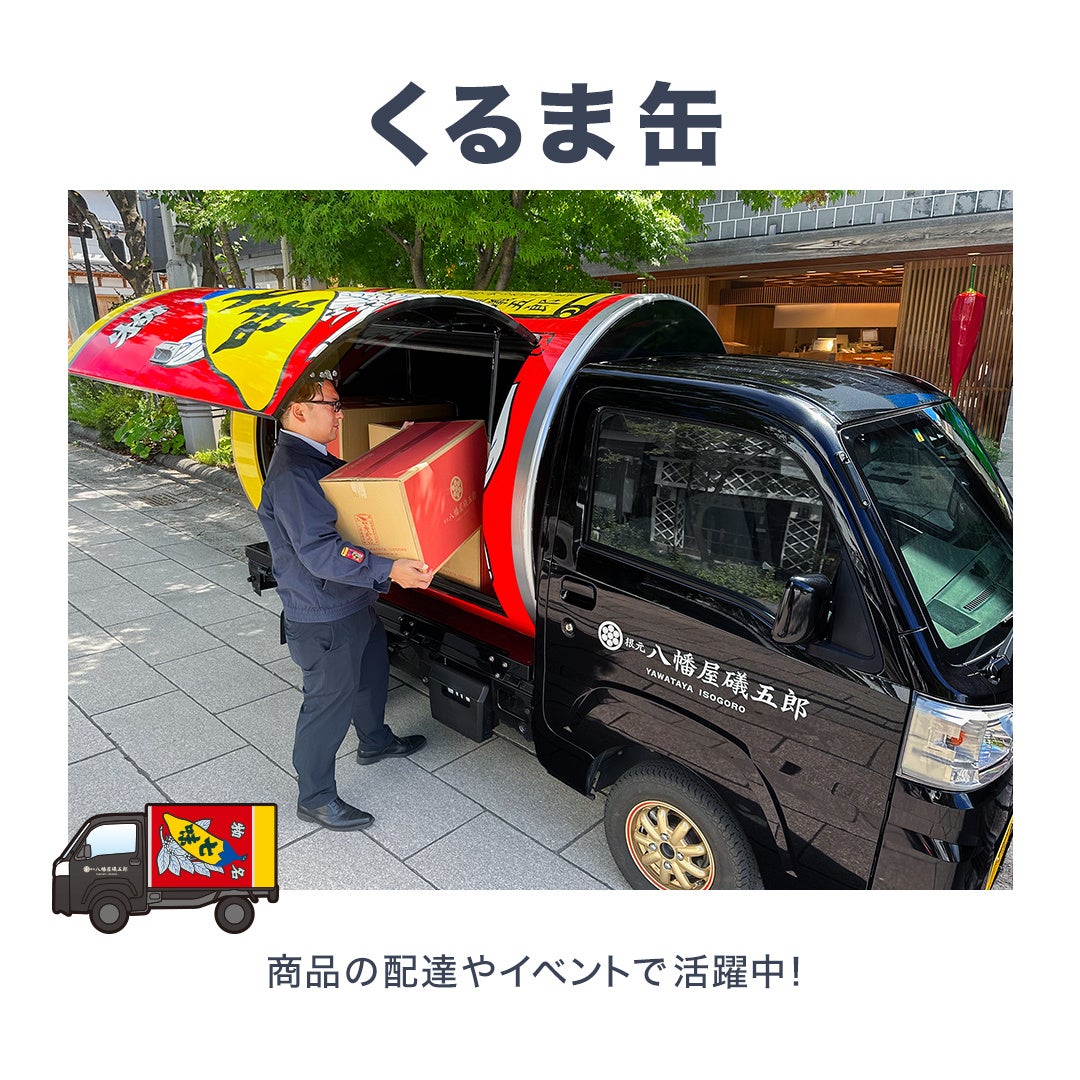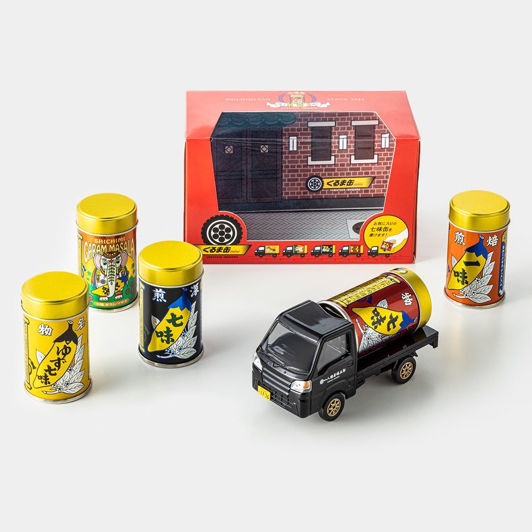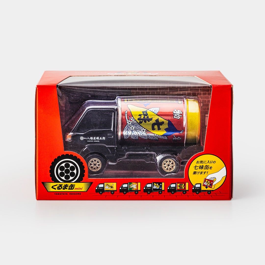 巨大な七味缶を乗せたようなデザインの《くるま缶》。2020年誕生以来、商品の配送やイベントで活躍中です。約1/30スケールのリアルなミニカーになって新登場。お気に入りの缶をおき、自分だけのくるま缶に!