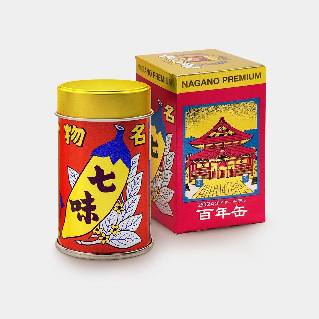誕生当時の七味缶デザインをオマージュした《百年缶》。全ての素材を長野県産にこだわったプレミアムな一缶です。〈百年間〉の感謝の気持ちを込めて、〈百年缶〉を皆さまにお届けいたします。