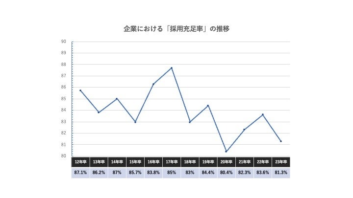 日本では戦前から新卒一括採用が主流ですが、近年その限界が露呈しつつあります。2023年卒の企業における採用充足率は81.3%と過去最低水準となり(※1)、半数を超える53.6%の企業が質か量かのいずれかに不満を持っています。特に39.5%の企業で「内定辞退の増加」が挙げられており、企業と学生間のミスマッチは深刻化しています。