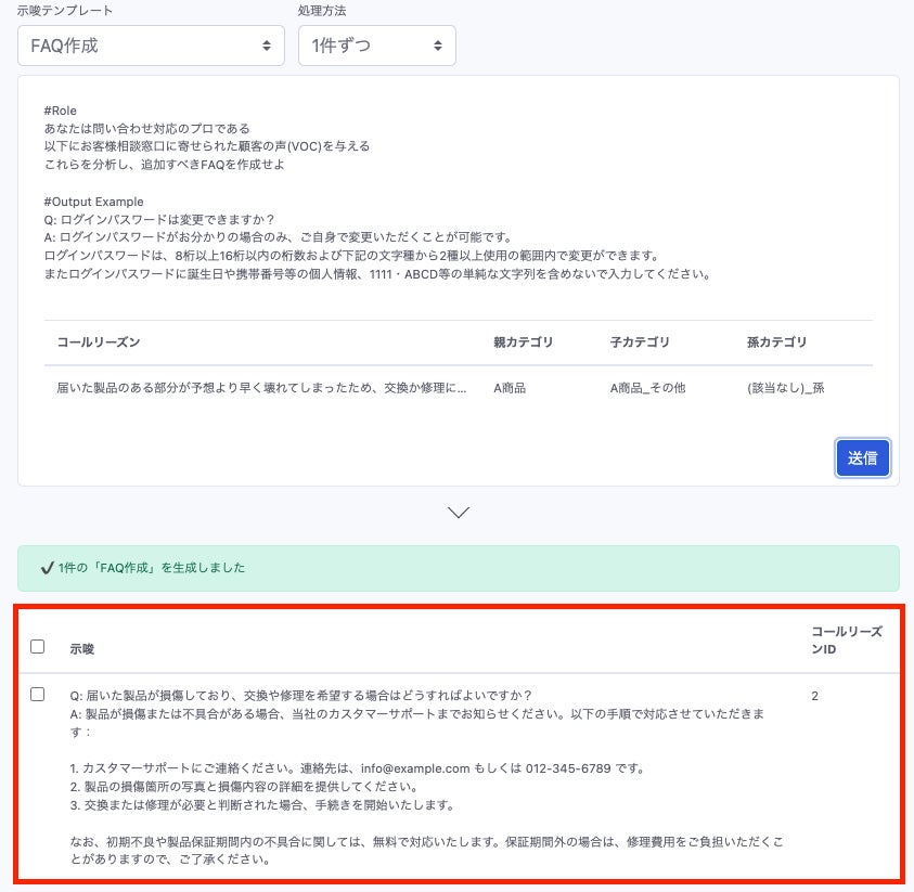 音声データから抽出された問い合わせ内容(=コールリーズン)をもとに、FAQに追加するQとAを自動で作成することが可能となりました。