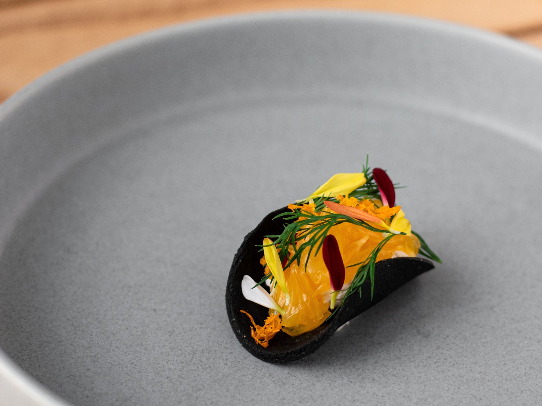 アミューズタコス エディブルフラワー(柴田農園)/熟成生ハム(鹿熊牧場)