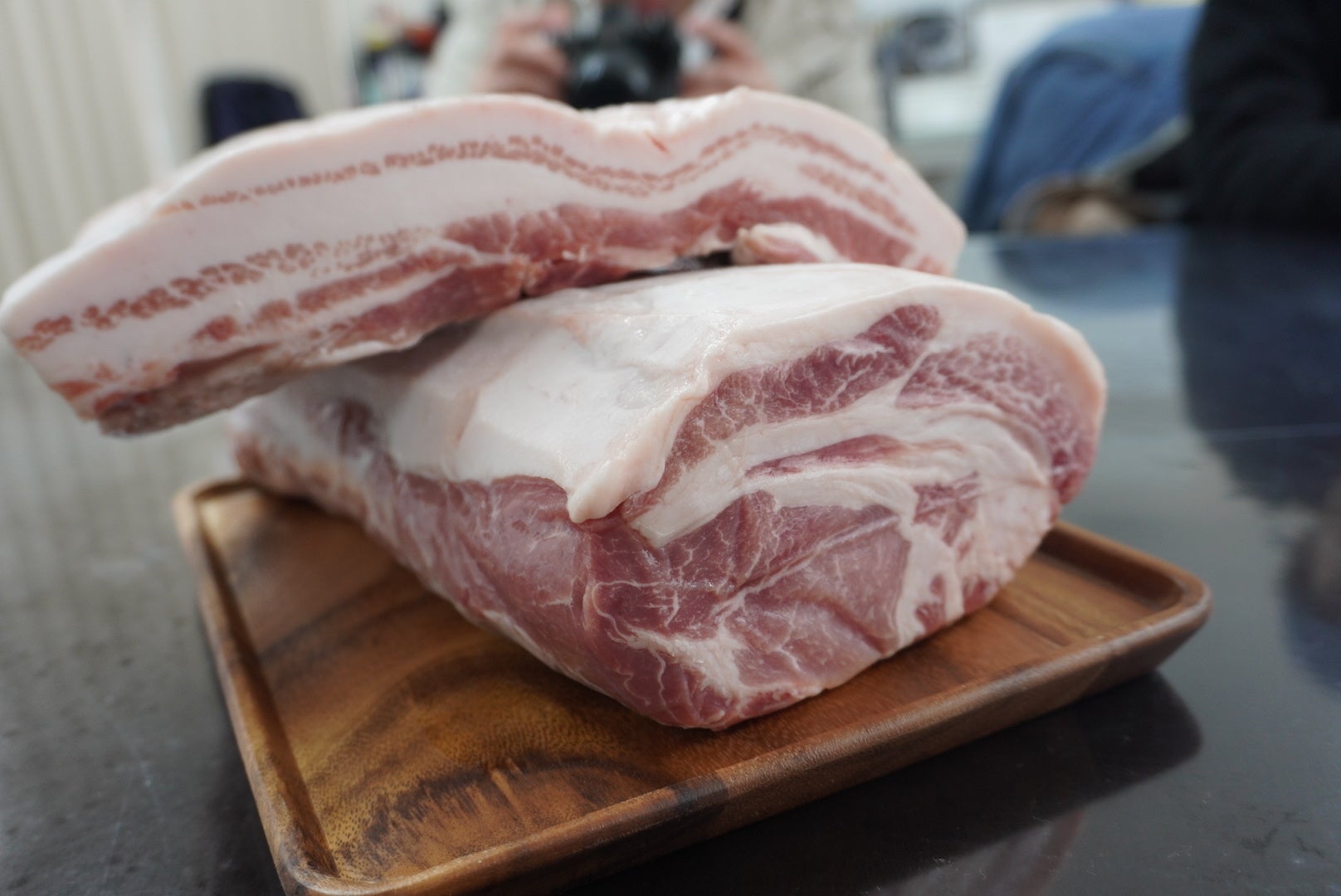 豚肉といえば、イベリコやアグー、マンガリッツァ、ランドレースなど品種に目が向けられたり、飼料や飼育環境を付加価値にしたブランド豚が多くありますが、訪ねた農家ともスーパーでよく見かける「三元豚」(三世代にわたって掛け合わせをしたもの)を育てている養農家でした。